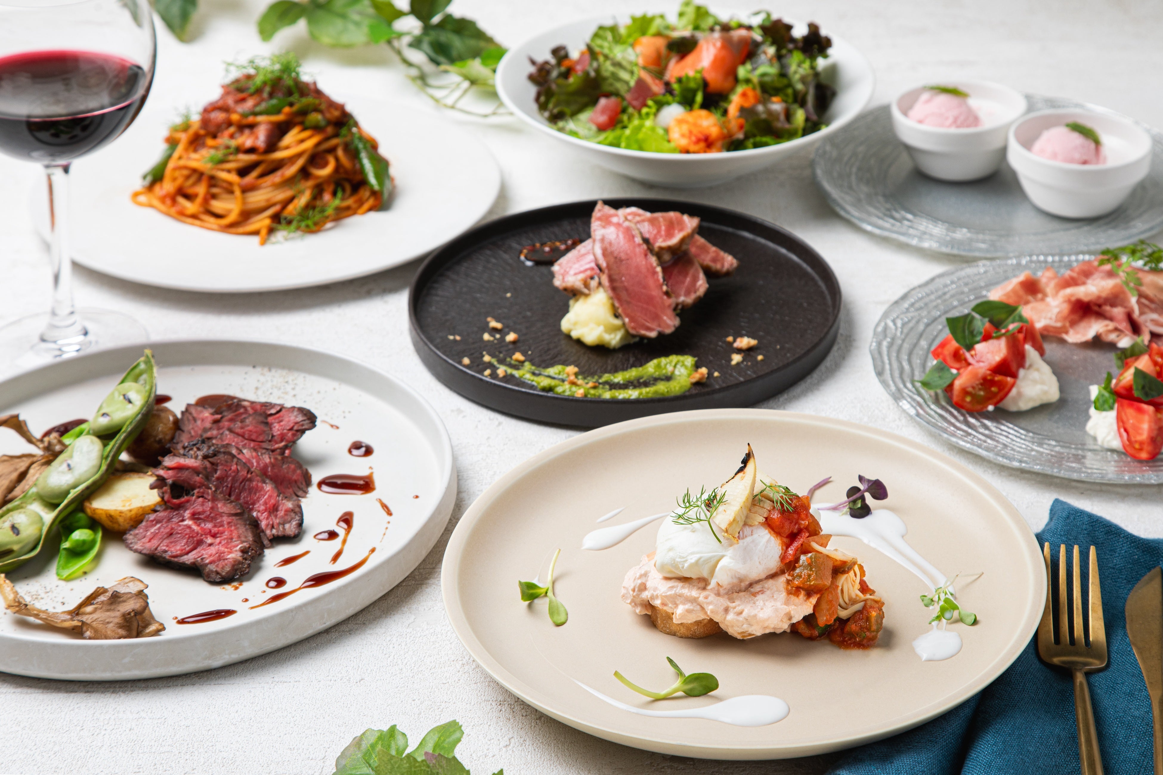 ・初夏野菜の自家製ナムル、炙りフィレ肉のユッケ、季節の前菜