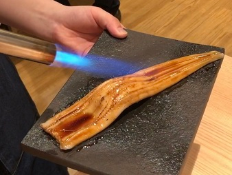 注文が入ってから、一度蒸し器に入れて、身をふっくらさせた後、甘だれをかけた穴子をお客さまの目の前で炙る、見ても楽しい寿司です。