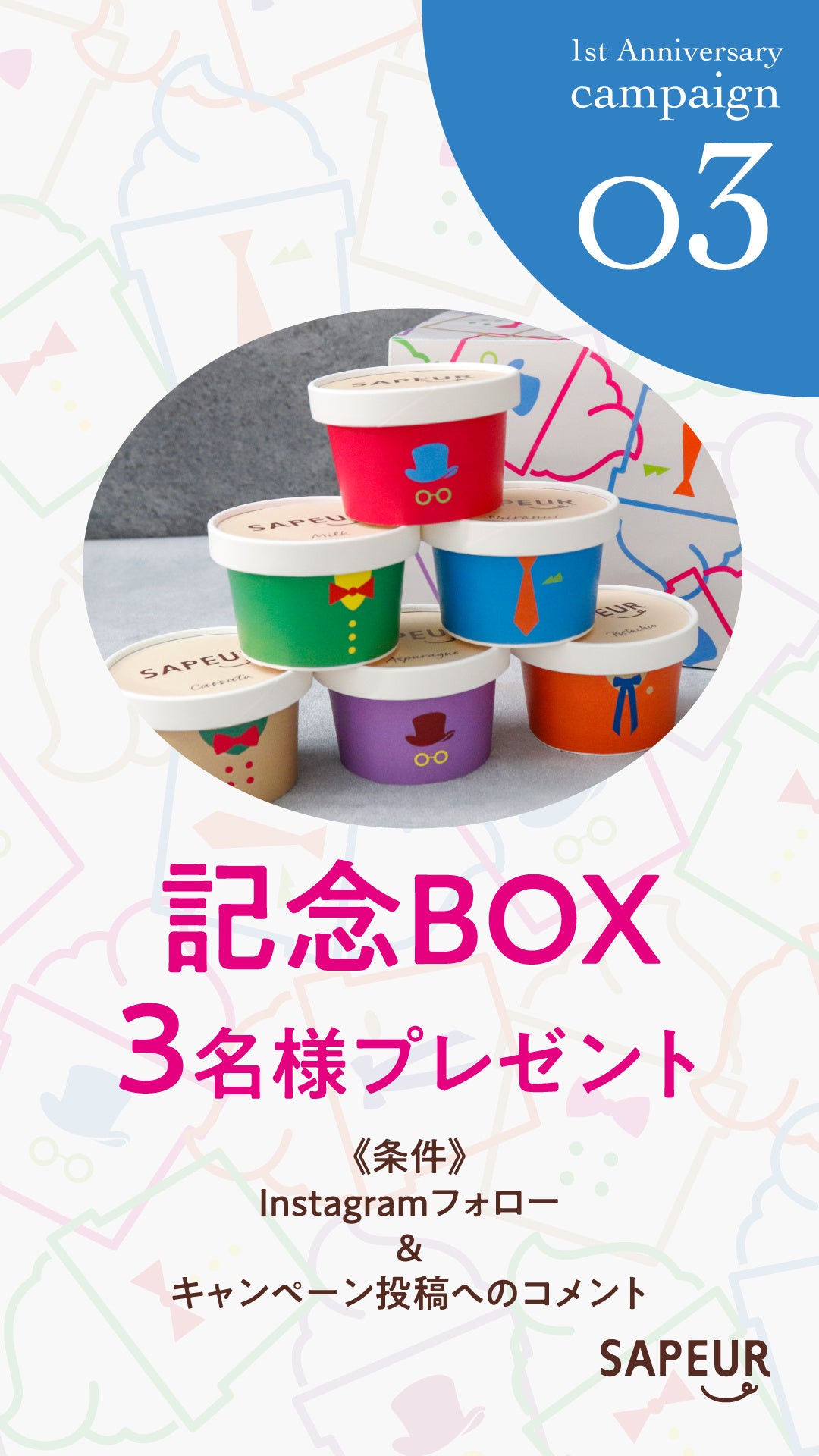 サプールのInstagramをフォローして、該当のキャンペーン投稿へコメントしてくださった方の中から抽選で3名様に「1周年記念BOX」(ジェラート6個入り)をプレゼントいたします。