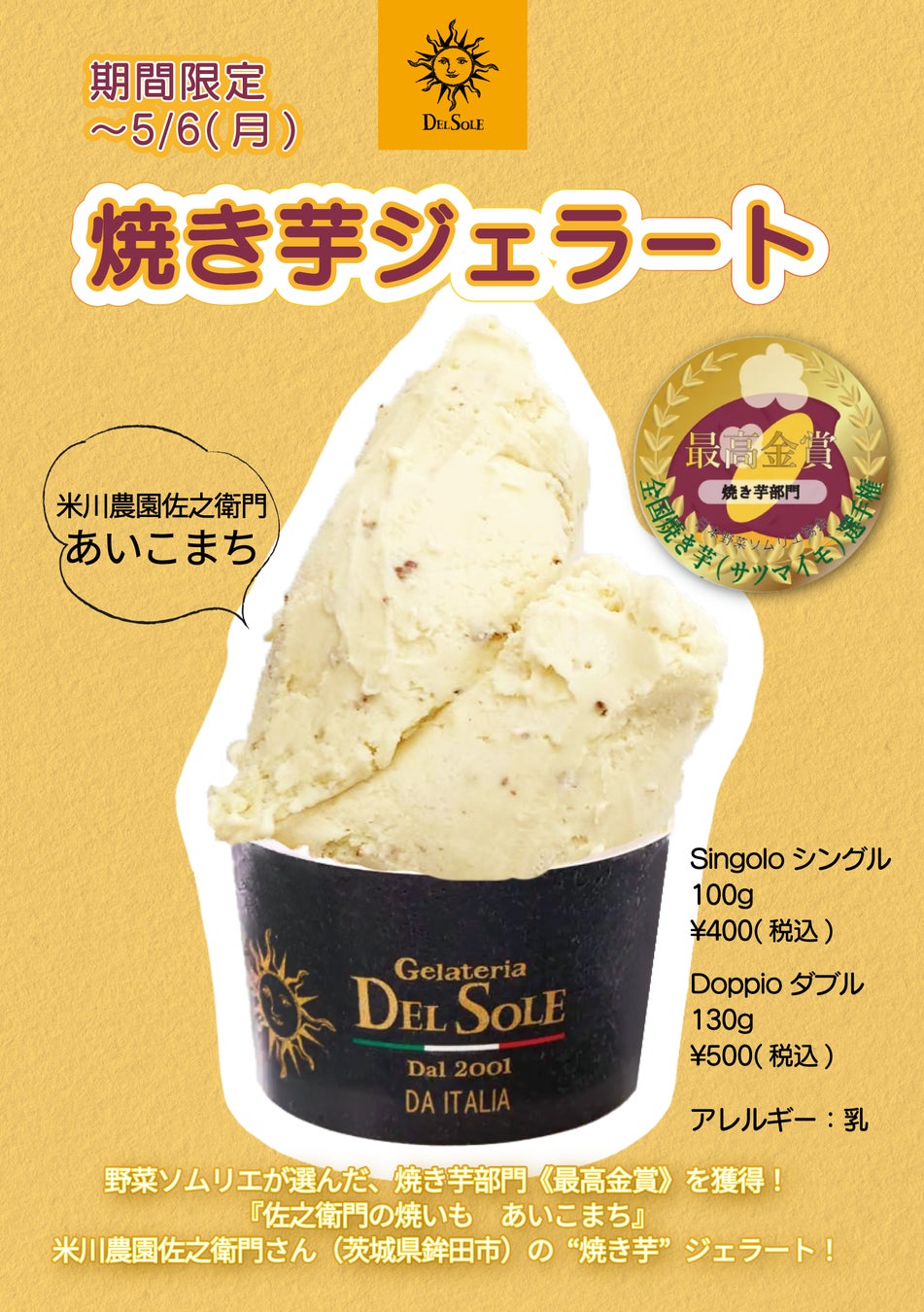 野菜ソムリエ協会とのコラボレーション第2弾となる、「野菜ソムリエ」が選んだ焼き芋部門《最高金賞》『佐之衛門の焼き芋 あいこまち』の焼き芋ジェラートが新登場!