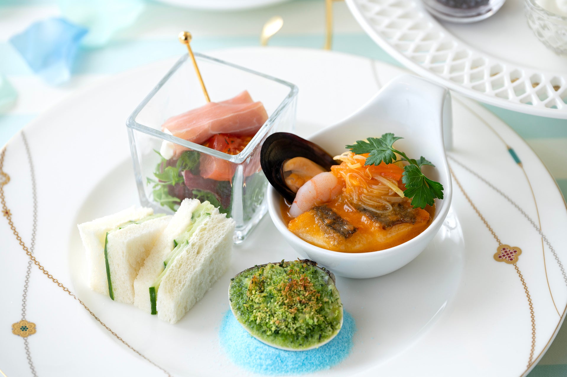 ブイヤベース、ハマグリのブルギニヨングラタン、キューカンバーサンドイッチ、生ハムとブッラータチーズのピンチョス