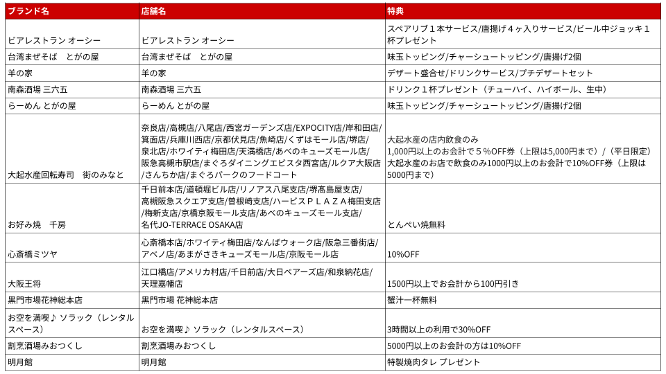 ■対象ブランドと店舗・特典内容(今後参加店舗は順次追加・変更になる予定がございます)
