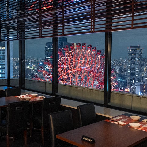 ■席数約100席のメインフロアからはHEPの真っ赤な観覧車が目の前にご覧いただけます。ランチタイムもディナータイムも素晴らしい梅田の都会のパノラマが楽しめます。デートや、ご友人・ご家族とのお食事にぜひ