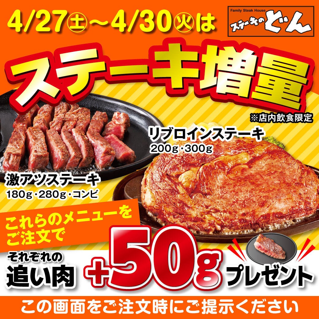 柔らかな食感と旨味が特長の熟成リブロインステーキや、どん人気NO.1の激アツステーキがお得!対象メニューご注文で「追い肉50g」をプレゼント
