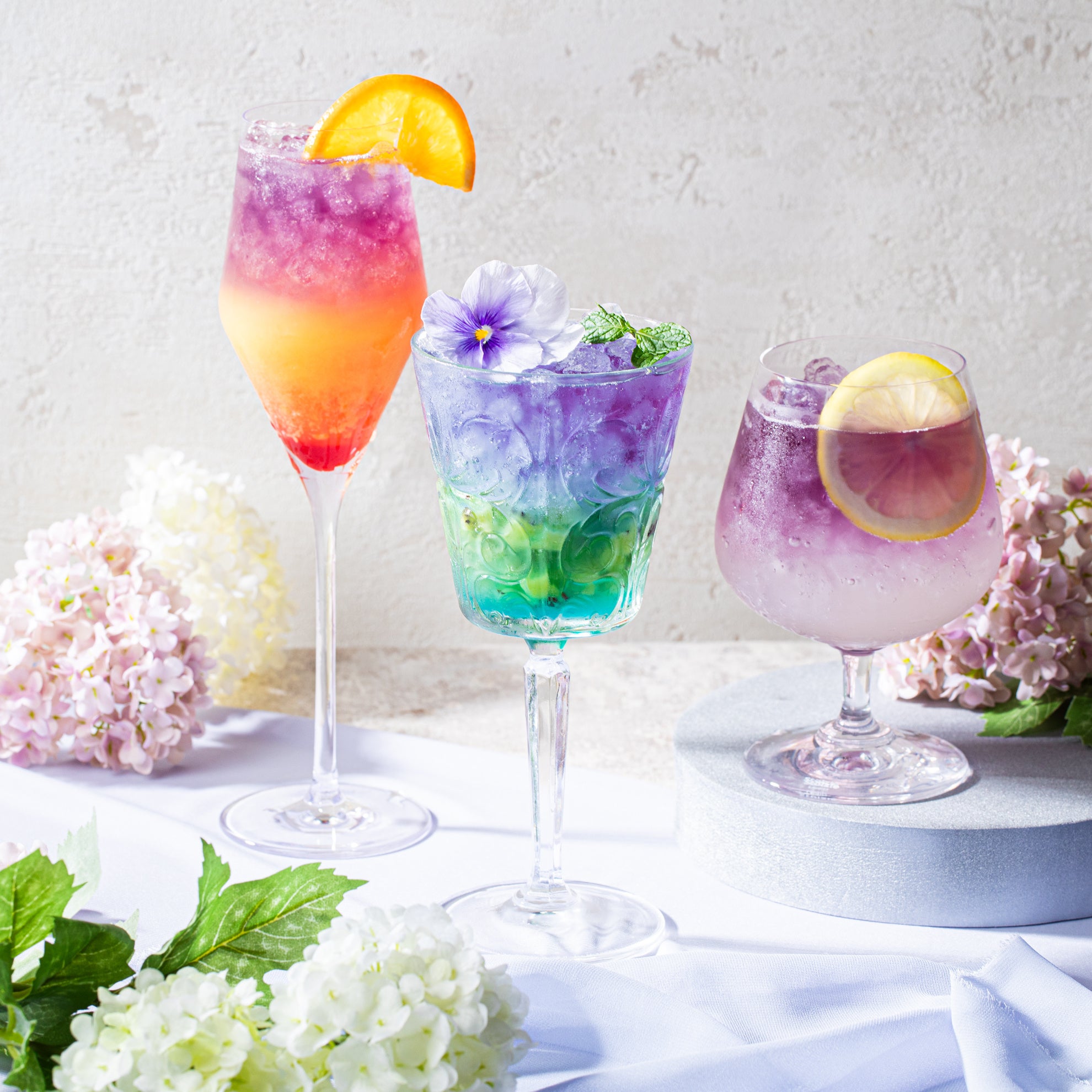 キウイやミントで爽やかさを組み合わせ、紫陽花に見立てた色鮮やかなカクテルは混ぜることで色の変化も楽しめる【バタフライエフェクト】、