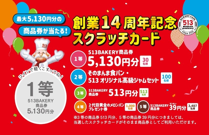 5月10日(金)~12日(日)の3日間に税込1,500円以上パンをご購入いただいた方には、全店合計5,130名様限定で、最大5,130円分の商品券が当たるスクラッチカードを1枚プレゼントいたします!!豪華景品が当たるこの期間にぜひご来店ください!