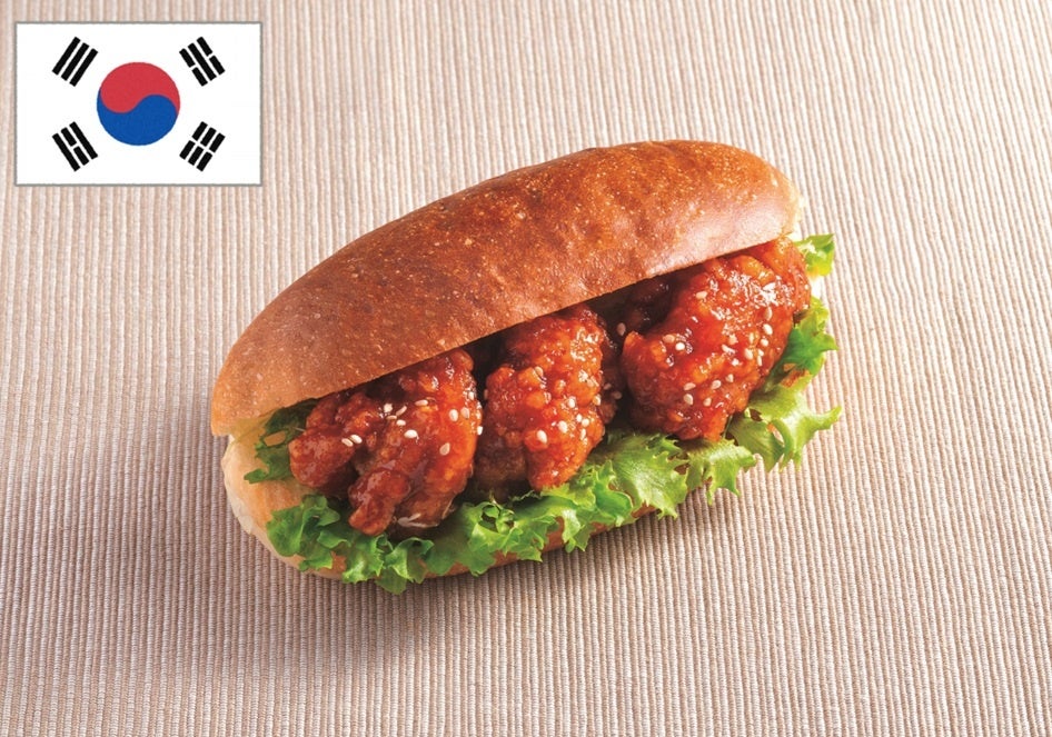 やわらかい鶏もも肉に甘辛ダレがたっぷり絡んだ韓国風チキン”ヤンニョムチキン“をサンド。コチュジャンが効いた甘辛い味付けが食欲をそそります!