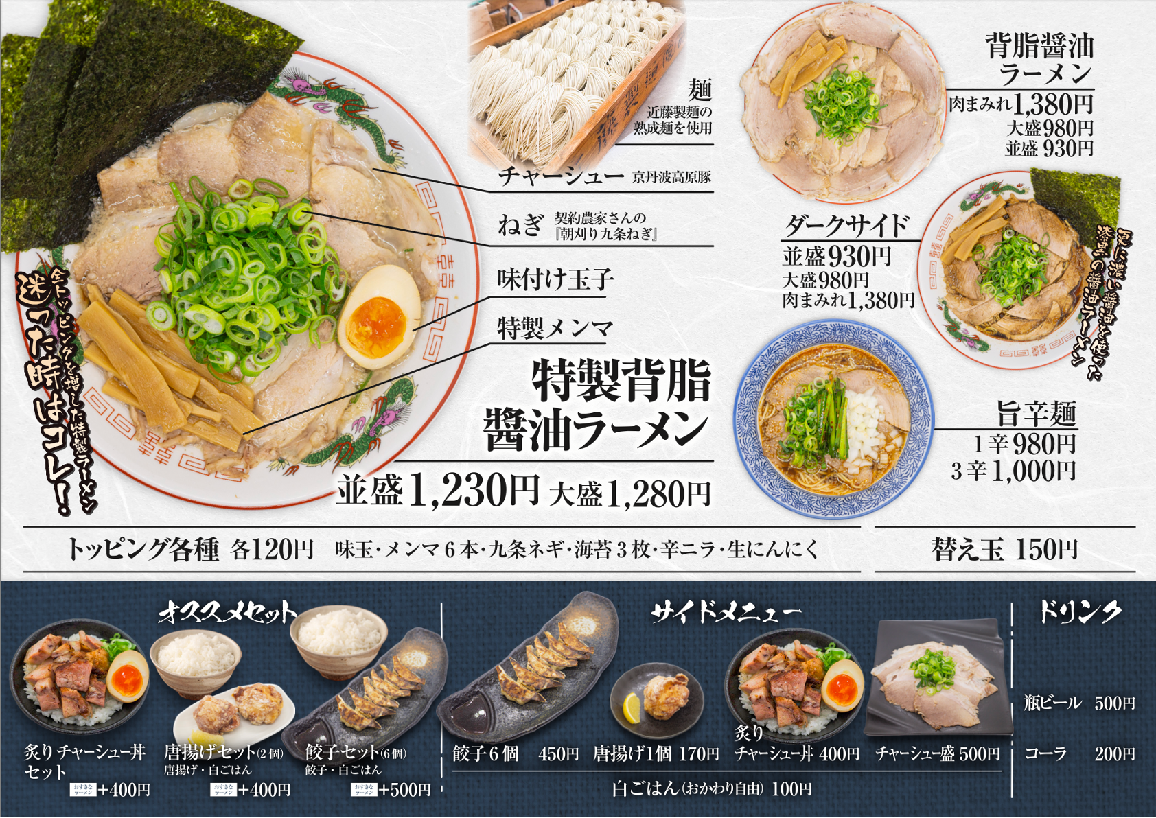 メニュー 〜京都のブランド豚をふんだんに使用した”肉まみれ”特製醤油ラーメンも〜
