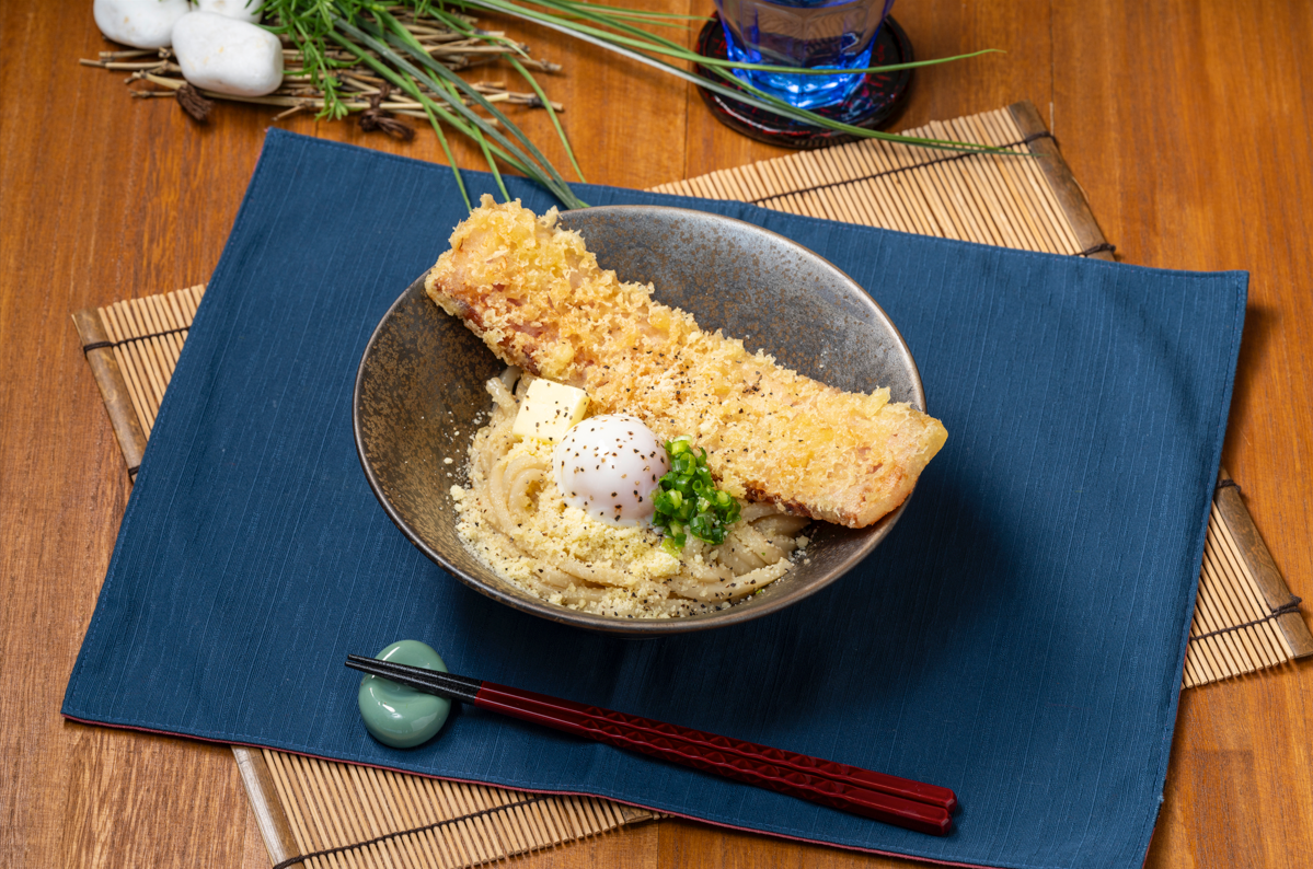 ・『ベーコン天と温玉の釜バター醤油うどん』