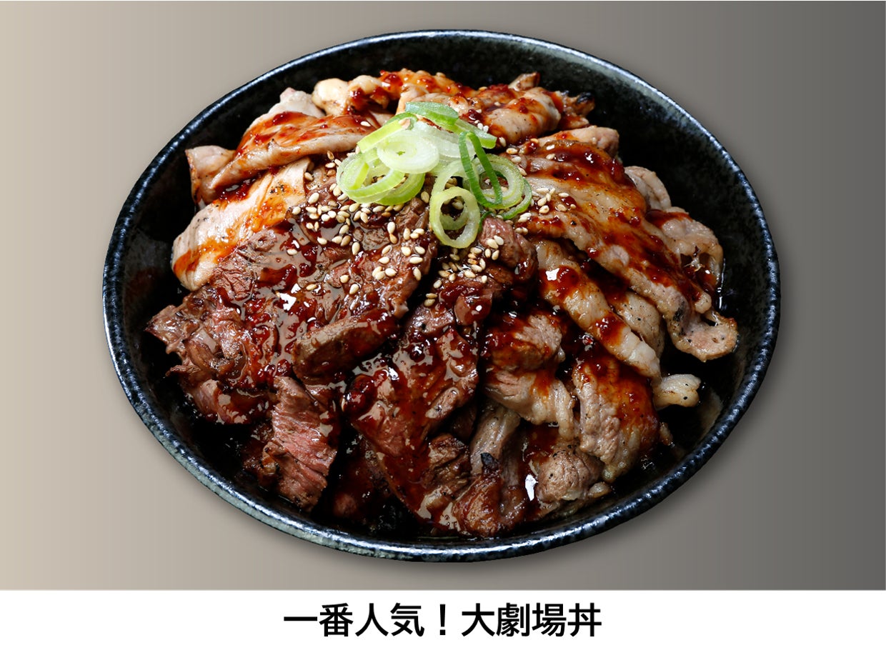 5月1日のオープン日から5月6日のGW期間中、カルビ・ハラミ・せせりの3種類のお肉がたっぷり入った看板商品『劇場丼』がなんと500円引きになるオープニングキャンペーンを実施します。