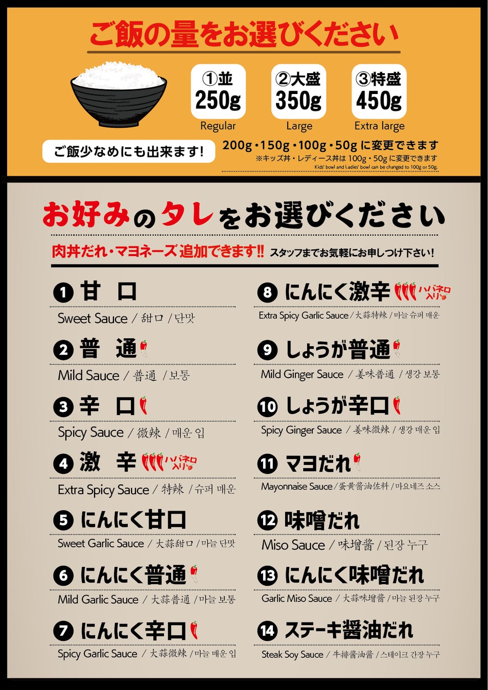 肉丼は専用のオリジナルソースから選ぶ事が出来ます。その数はなんと14種類!ご飯もお好みの量を選べます。