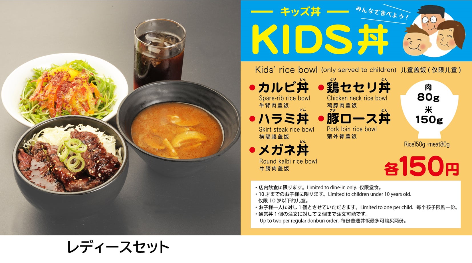 お子様や、女性といったファミリーに嬉しいメニューもあります。お得なレディースセットには、選べるミニ丼とサラダ、スープ、ドリンクが付いています。 お子様連れに嬉しいキッズ丼は、なんと衝撃の150円!(税込み)