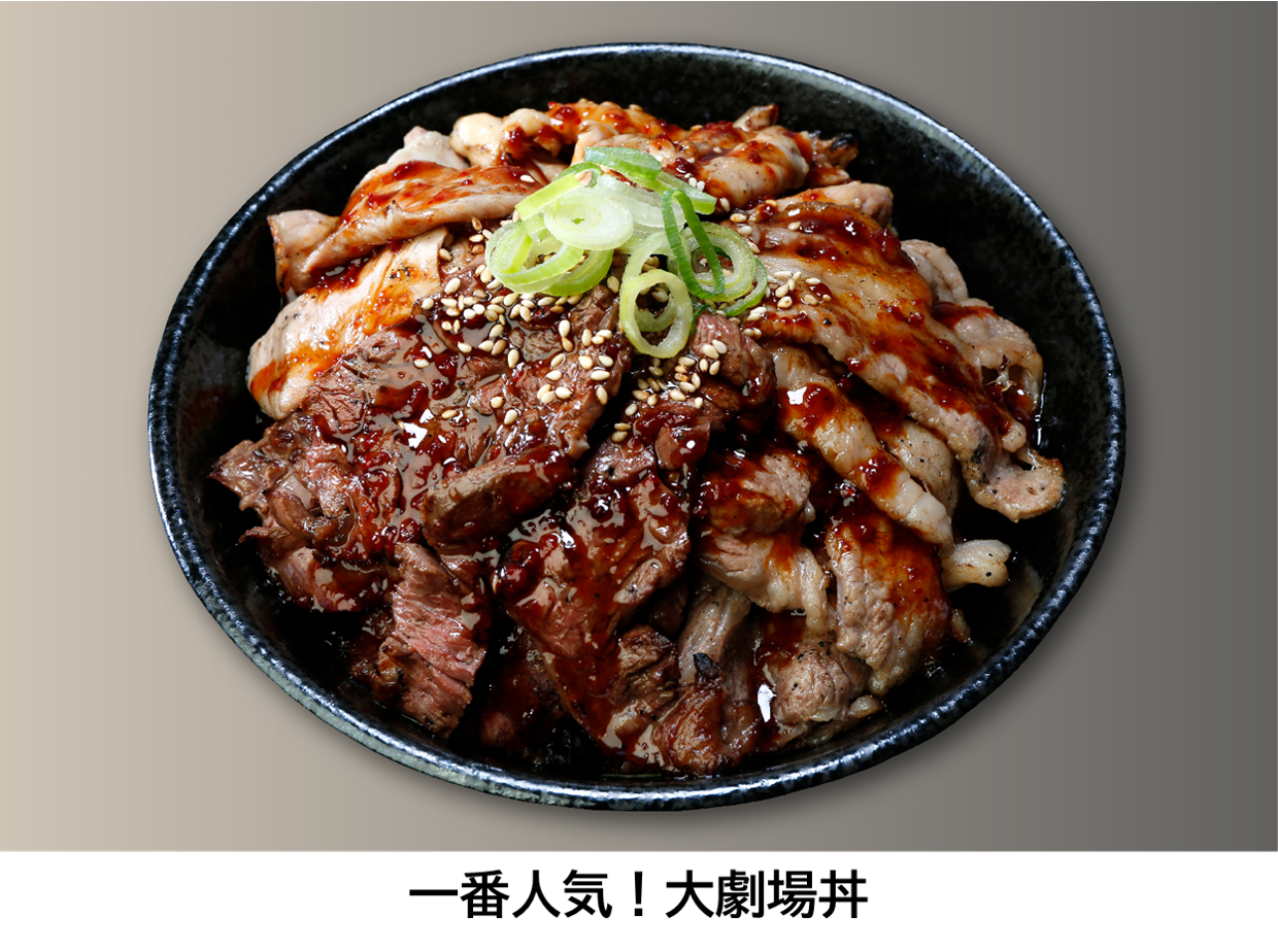 5月1日のオープン日から5月6日のGW期間中、カルビ・ハラミ・せせりの3種類のお肉がたっぷり入った看板商品『劇場丼』がなんと500円引きになるオープニングキャンペーンを実施します。