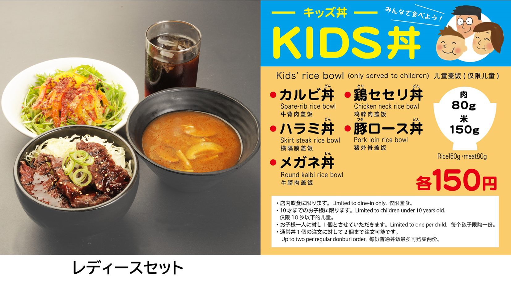 お子様や、女性といったファミリーに嬉しいメニューもあります。お得なレディースセットには、選べるミニ丼とサラダ、スープ、ドリンクが付いています。 お子様連れに嬉しいキッズ丼は、なんと衝撃の150円!(税込み)