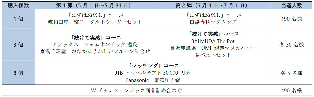 「マッチング」コースもしくは「続けて実感」コースのいずれかに応募し外れた方のなかから、抽選で490名様に「フジッコ商品詰め合わせ」が当たります。