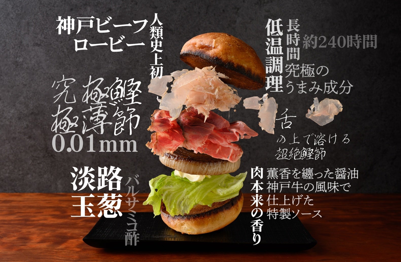 神戸牛の希少部位を約240時間以上という超超長時間低温調理するという、人類史上初めての調理法で、究極のうまみ成分を引き出したロービーを完成させました。ジューシーかつコラーゲンの柔らかい食感と肉本来の香りが食べた瞬間に広がります。薫香を纏った醤油と神戸牛の風味で仕上げた特製ソースにディジョンマスタードを加え、バルサミコ酢の酸味を加えた厚切り淡路の玉葱、クライマックスには、これまで削れなかった究極極薄0.01mmの鰹節を乗せて完成させます。舌の上で溶ける超絶鰹節と人類史上初超超長時間低温調理神戸ビーフのロービーとの初の出合いをご堪能ください。