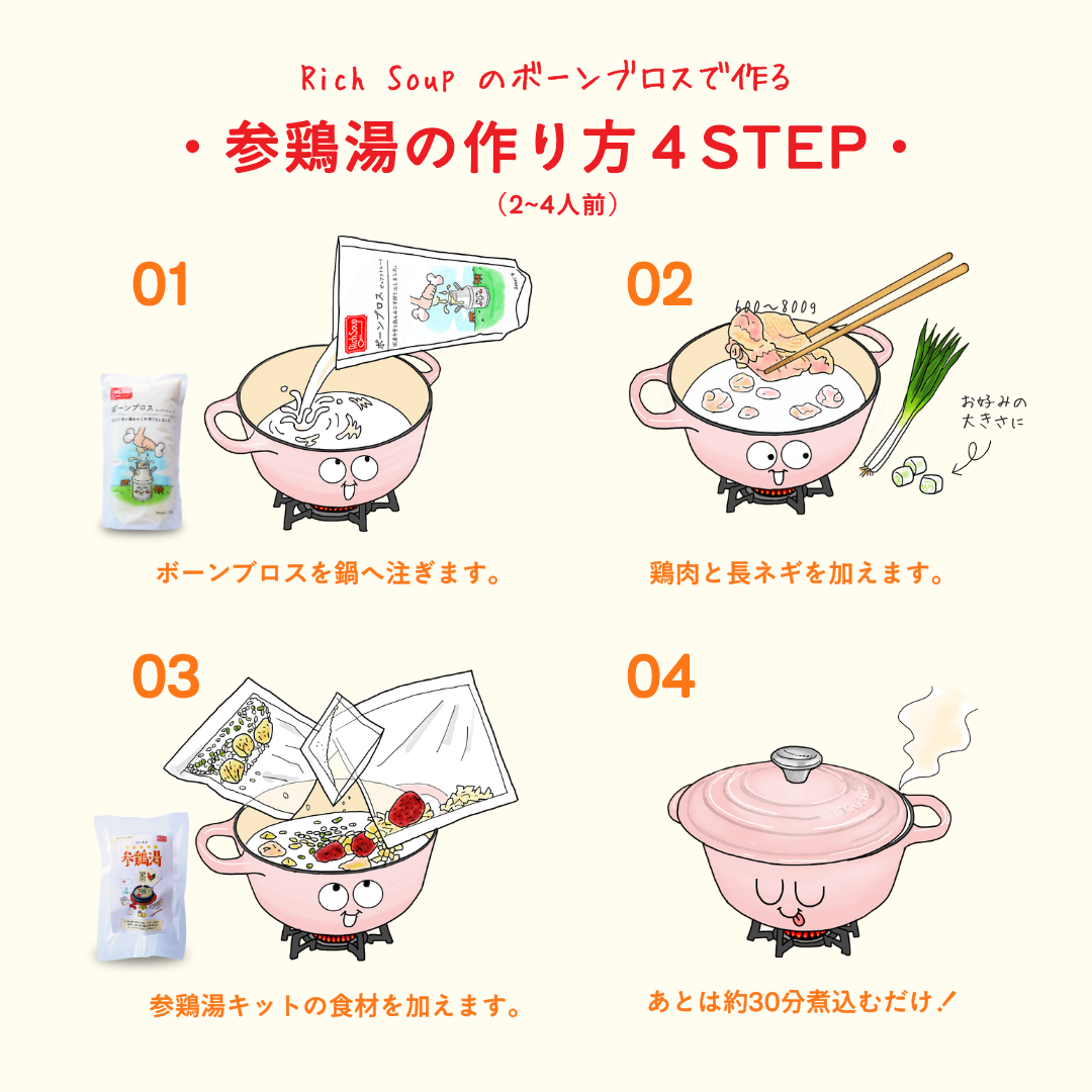Rich Soupで作る参鶏湯の一番の魅力は、薬膳食材と鶏肉を煮込んで滋養強壮効果を得る栄養食「参鶏湯」を、旨味も栄養も濃厚に溶け込んだRich Soupの「ボーンブロス」で作るという“夢の組み合わせ”であるということです。ボーンブロスではなく”水”を使っても参鶏湯を作ることができますが、旨味も栄養も物足りない仕上がりになってしまいます。