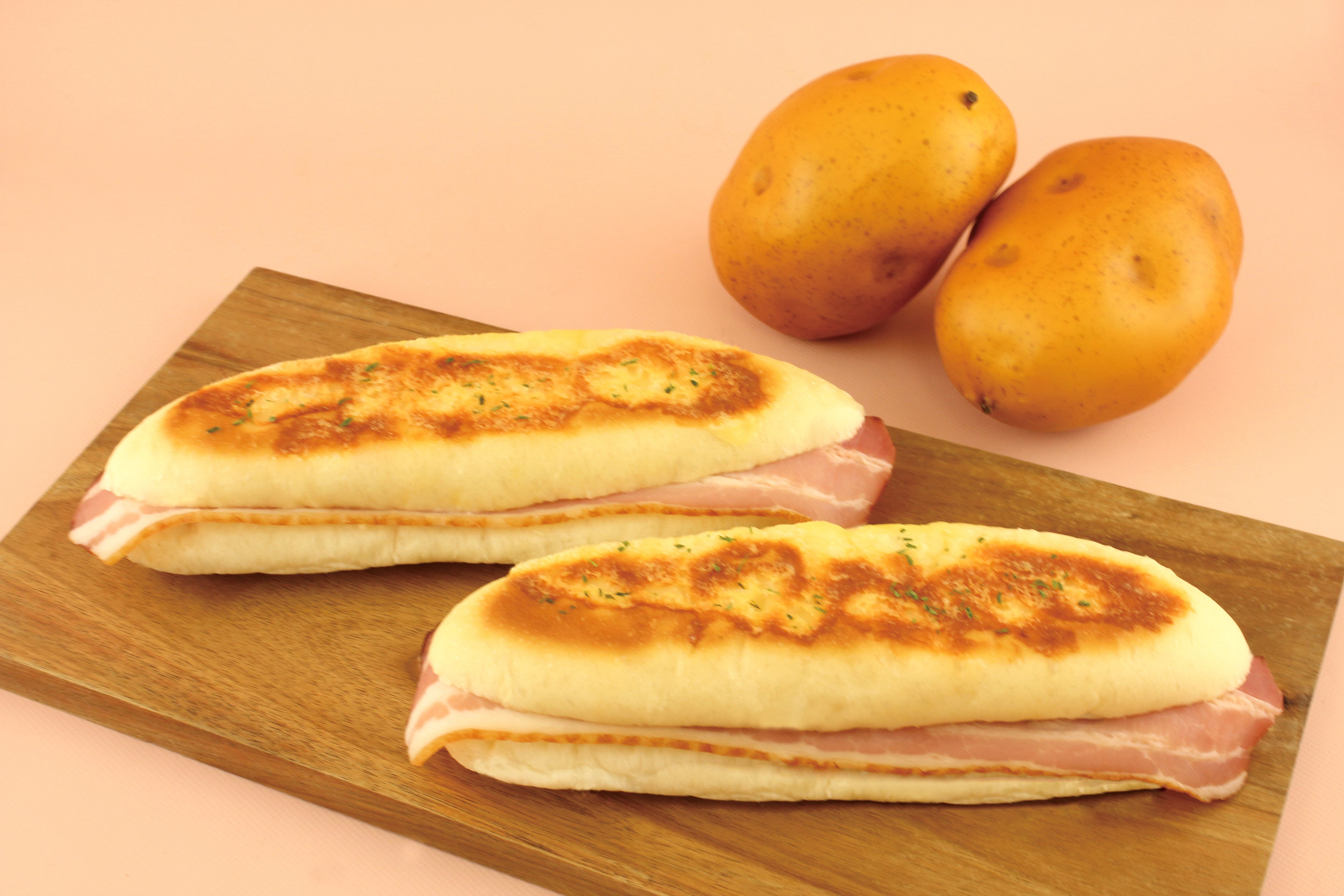 ふんわりとした食パン生地に、十勝士幌産のホクホクとした男爵のポテトサラダとベーコンを挟んで焼き上げました。カリっと焼き上げられたパンの表面にはシュレッドチーズがまぶされており、とろけるほど柔らかいポテトサラダとの相性は絶妙です。