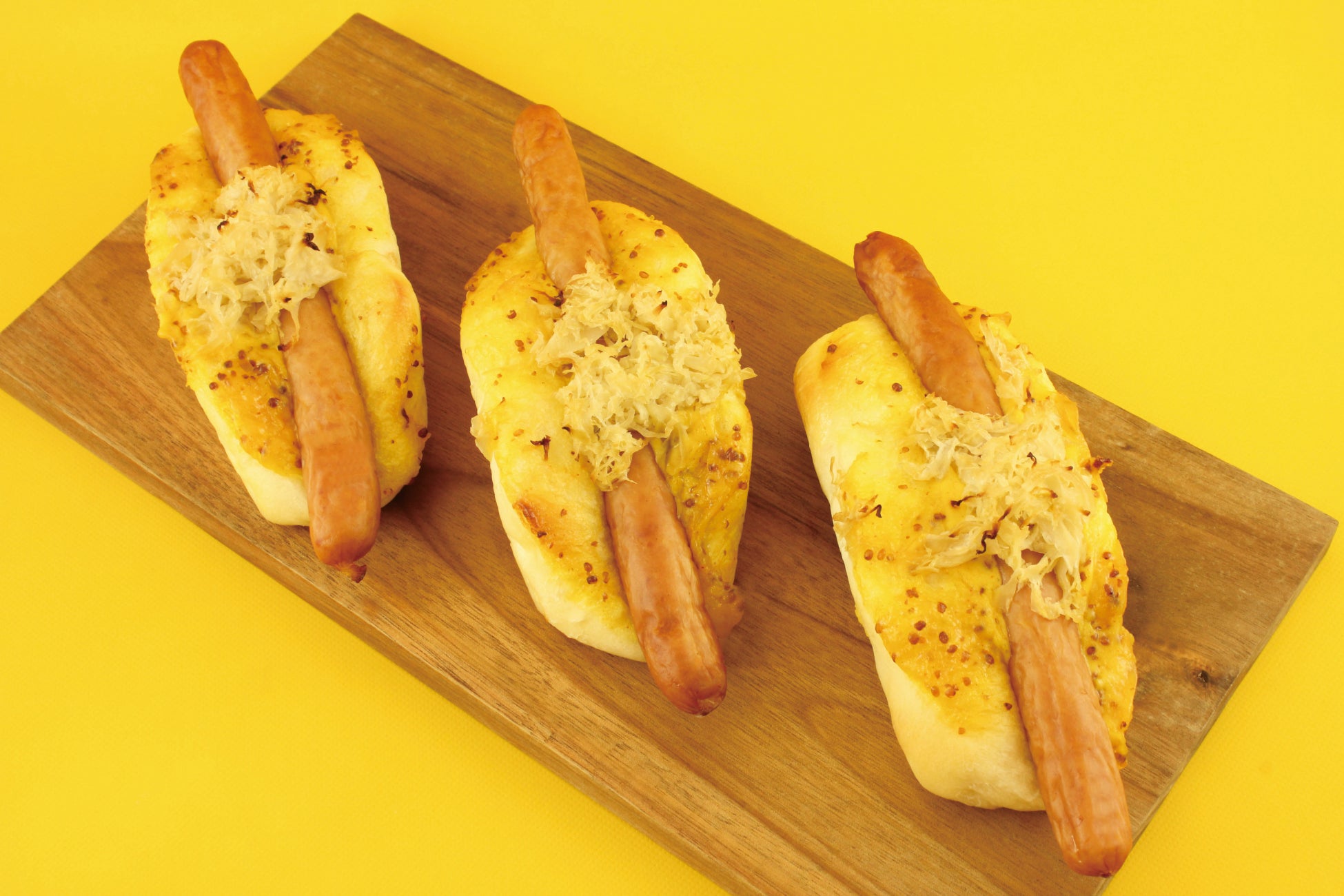 ソフトな生地にウインナーとマスタードフィリングとサワークラウトをトッピングし、焼き上げました。