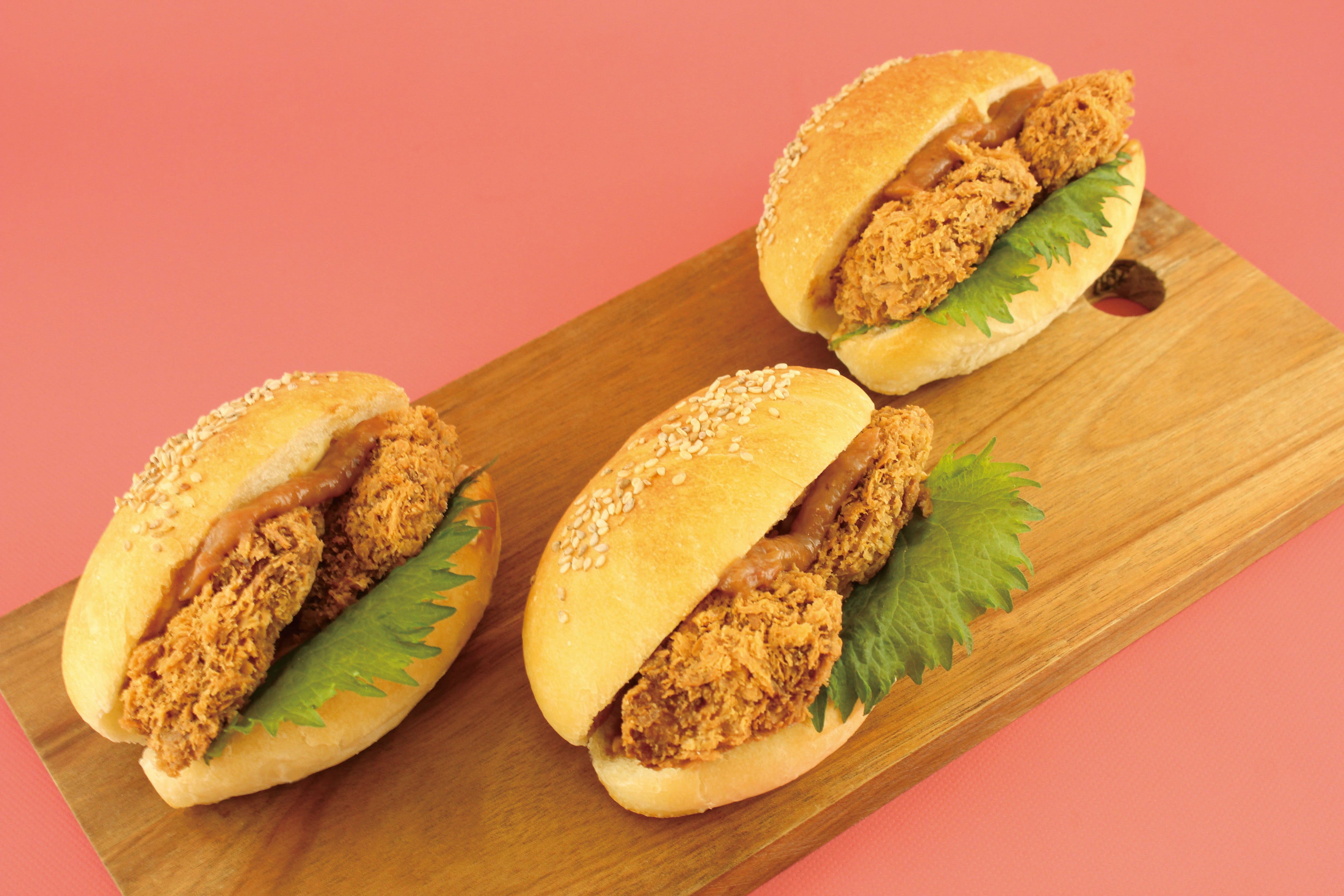 チキンカツと大葉、ねり梅をサンドしました。さっくり揚げられたチキンカツに、梅の酸っぱさと大葉のさっぱりとした風味が絶品です。