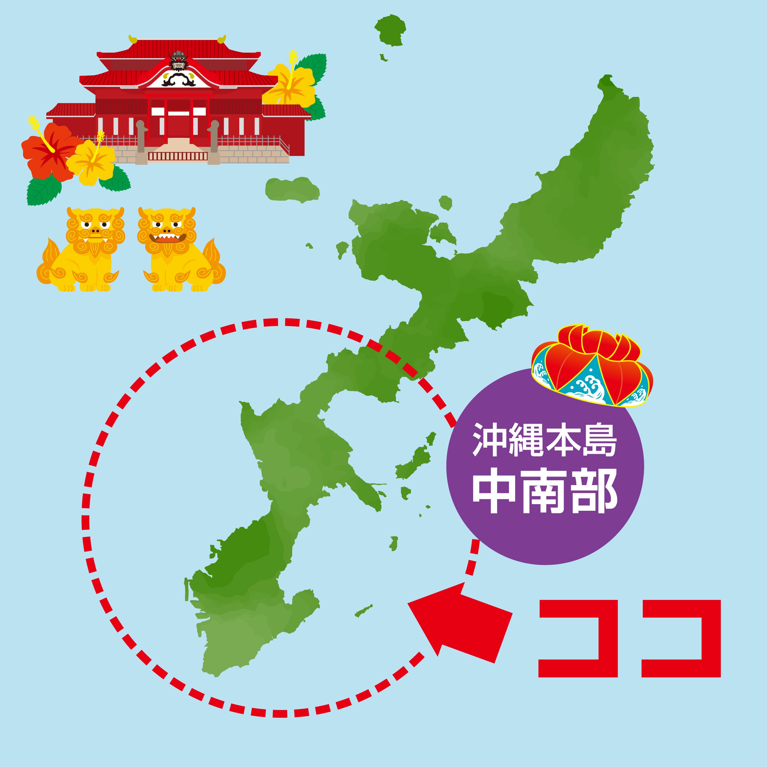 沖縄本島中南部といえば、人気観光地のアメリカンビレッジや首里城、国際通りなど、シティな街並みと豊かな自然がいい感じにチャンプルーした(混ざり合った)エリアです。