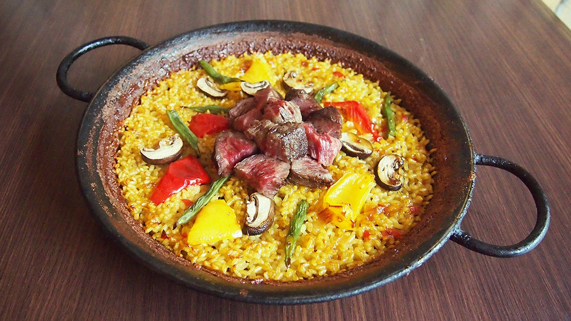 やわらかな赤身が特徴の熊本県産赤牛「延寿牛」と、自家製コンソメスープで炊き上げたパエリアです。