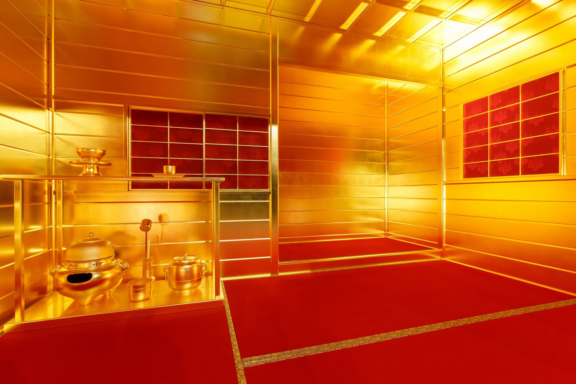 織田信長は、権力を誇示するため「名物狩り」※1を行い、収集した茶道具で茶会を催しました。また、勲功のあった武将には茶器を与え、茶会を催すことを許可しました。豊臣秀吉においては、関白就任の際に禁中茶会を開いたり、黄金の茶室をつくらせるなど、天下人の権威を示しました。本展では当時の黄金の茶室や大茶会のパネルを展示し、その豪華な様子をご覧いただけます。