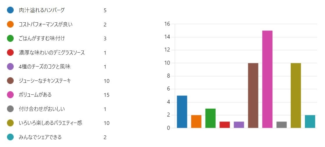 最も多くの票を集めたのは『ボリュームがある』というポイントでした。2位は『ジューシーなチキンステーキ』『いろいろ楽しめるバラエティー感』でした。
