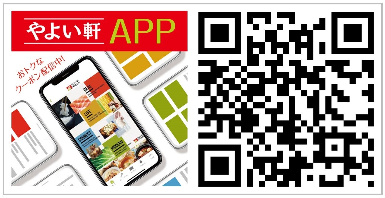 「やよい軒」公式アプリでは、新商品・キャンペーン情報・メニューの閲覧や店舗検索がご利用いただけます。また、定食やサイドメニューがお得になるQRクーポンを配信しております。