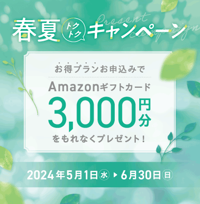 キャンペーン期間中、下記WEBサイトより「feel freeお得プラン」をお申し込みいただいた方に、Amazonギフトカード3,000円分をプレゼントいたします。
