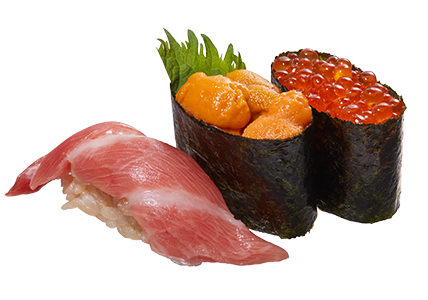 ■商品名:「ごほうび三貫盛(本まぐろ大とろ・生うに軍艦・いくら軍艦)」