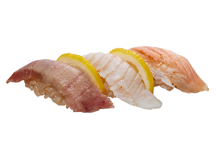 ■商品名:「とろ炙り塩レモン三貫盛(本まぐろ中とろ・大とろびんちょう・とろサーモン)」