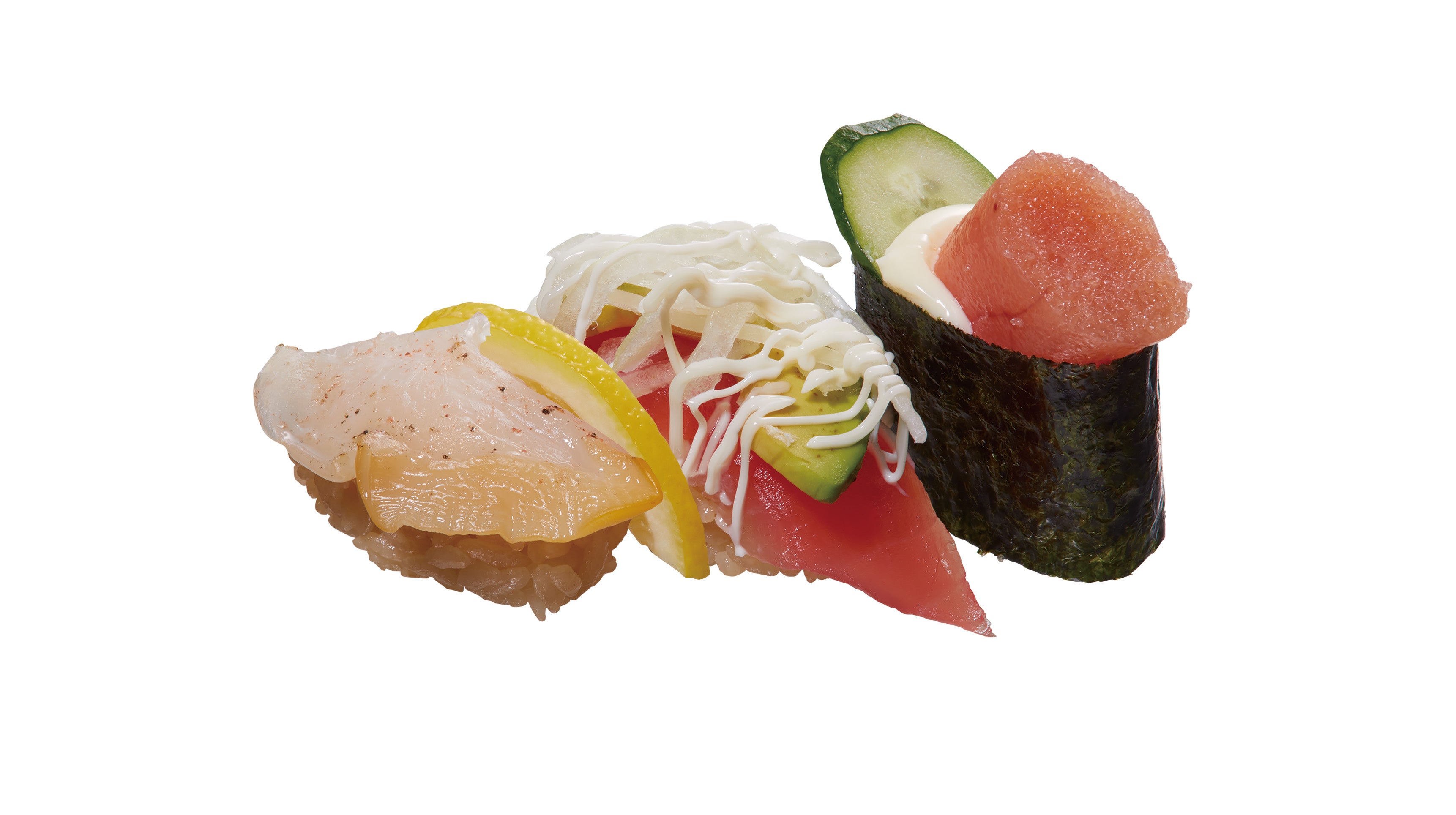 5月4日(土・祝)からは、ひと皿で三ネタを味わえる『三味祭』を開催いたします。「回転寿司みさき」が使用している“特製赤シャリ”は、まろやかな酸味とコクがネタの旨さをより一層際立たせ、今回の『三味祭』の寿司たちの味わいをより引き立てます。今回登場する商品の中でもおすすめは、「回転寿司みさき」で人気の三ネタである「まぐろ」、「はまち」、「ねぎまぐろ軍艦」を合わせた「売れてる“最強”三貫盛」です。対して、「まぐろアボカド」、「つぶ貝炙り塩レモン」、「たらマヨ軍艦」といった、自信作であるものの陰に隠れてしまっている三ネタとして「売れてない“最弱”三貫盛」も登場します。他にも、「漬けまぐろ」、「こはだ」、「煮あなご」の江戸前寿司を合わせた「王道江戸前三貫盛」に、人気の三ネタを漬けにした「漬け三貫盛」、「本まぐろ中とろ」や「とろサーモン」、「大とろびんちょう」の脂のり抜群のとろを炙り、ピンク岩塩とレモンを合わせてお召し上がりいただく「とろ炙り塩レモン三貫盛り」も登場いたします。
