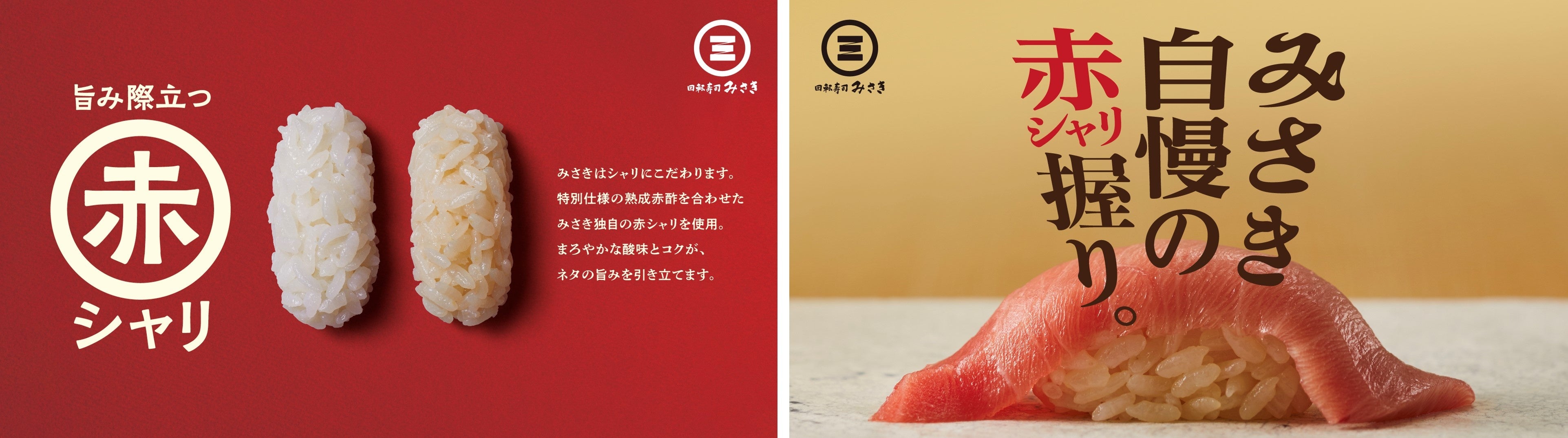 「回転寿司みさき」では、2023年10月に“赤シャリ”をリニューアルいたしました。赤酢を合わせた“赤シャリ”は、ネタの旨味を最大限引き出し、寿司の旨さを決める重要な要素です。2年以上じっくりと熟成させた酒粕を原料とした赤酢の割合を増やし、まろやかな酸味とコク・風味を感じられるように独自の酢の配合を行った“特製赤シャリ”で寿司をご提供しています。