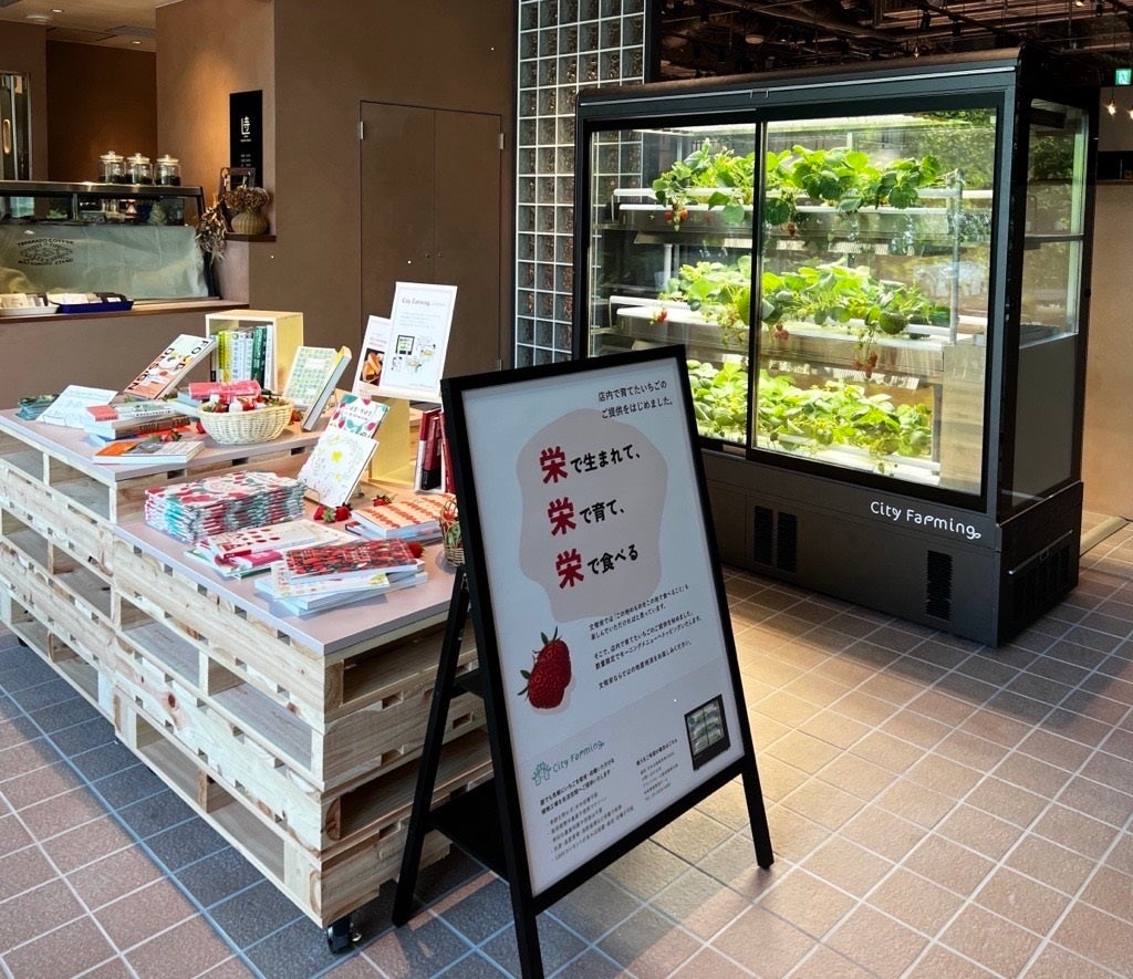 「文喫 栄」に併設されている「POP UPスタンド COFFE-コッフェ-」内に、「City Farming」を設置いたします。大きな窓から久屋大通公園が一望できる、開放的なカフェ空間の中で、季節を問わず毎日成長するいちごをご覧いただけます。
