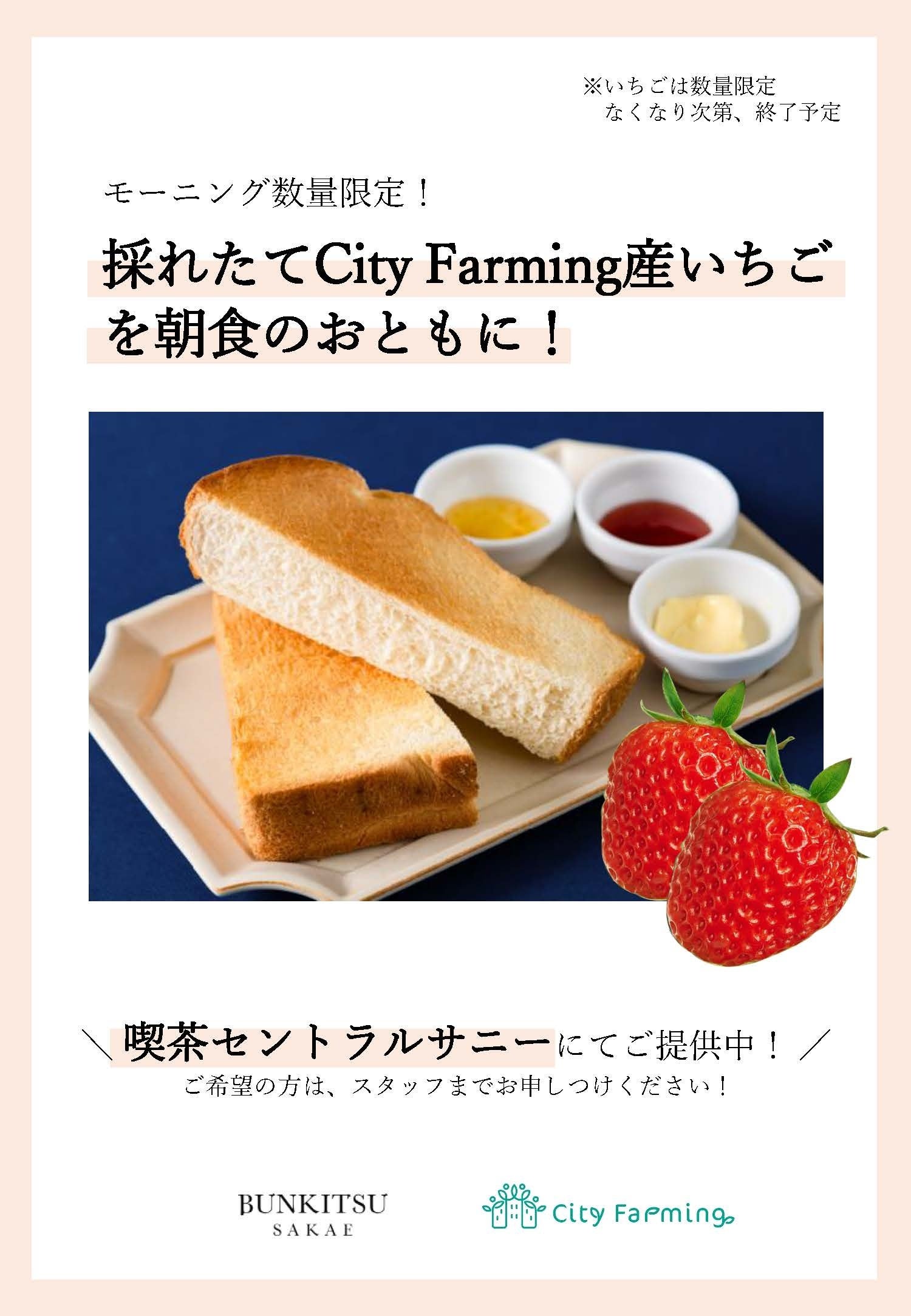 「文喫 栄」に併設されている「喫茶 セントラルサニー」では、7:30~11:00にご来店いただいたお客様に、モーニングサービスとして、トーストを無料でご提供しております(追加料金をお支払いいただくことで、メニューのアップグレードも可能)。モーニングメニューをご利用のお客様には、その日収穫できたいちごの数限定でトッピングしてご提供させていただきます。