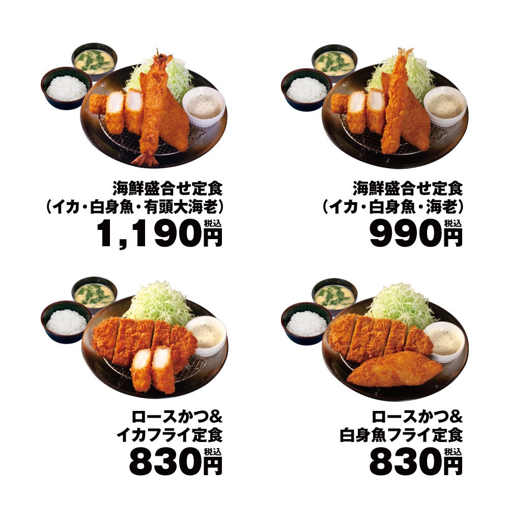商品名 海鮮盛合せ定食(イカ・白身魚・海老) 990円 海鮮盛合せ定食(イカ・白身魚・有頭大海老) 1,190円 ロースかつ&イカフライ定食 830円 ロースかつ&白身魚フライ定食 830円 イカフライ単品 300円 白身魚フライ単品 300円 ※お持ち帰りいただけます。お持ち帰りのみそ汁は、別途60円でお買い求めいただけます。 ※全て税込価格です。また、店内・お持ち帰りの税込価格は同一です。 ※株主優待券は上記全てのメニューにご使用いただけます。(単品は除きます。) 発売日 2024年5月8日(水)午後3時 対象店舗 一部店舗を除く全国の松のや ※高速PA店舗を除く。 |