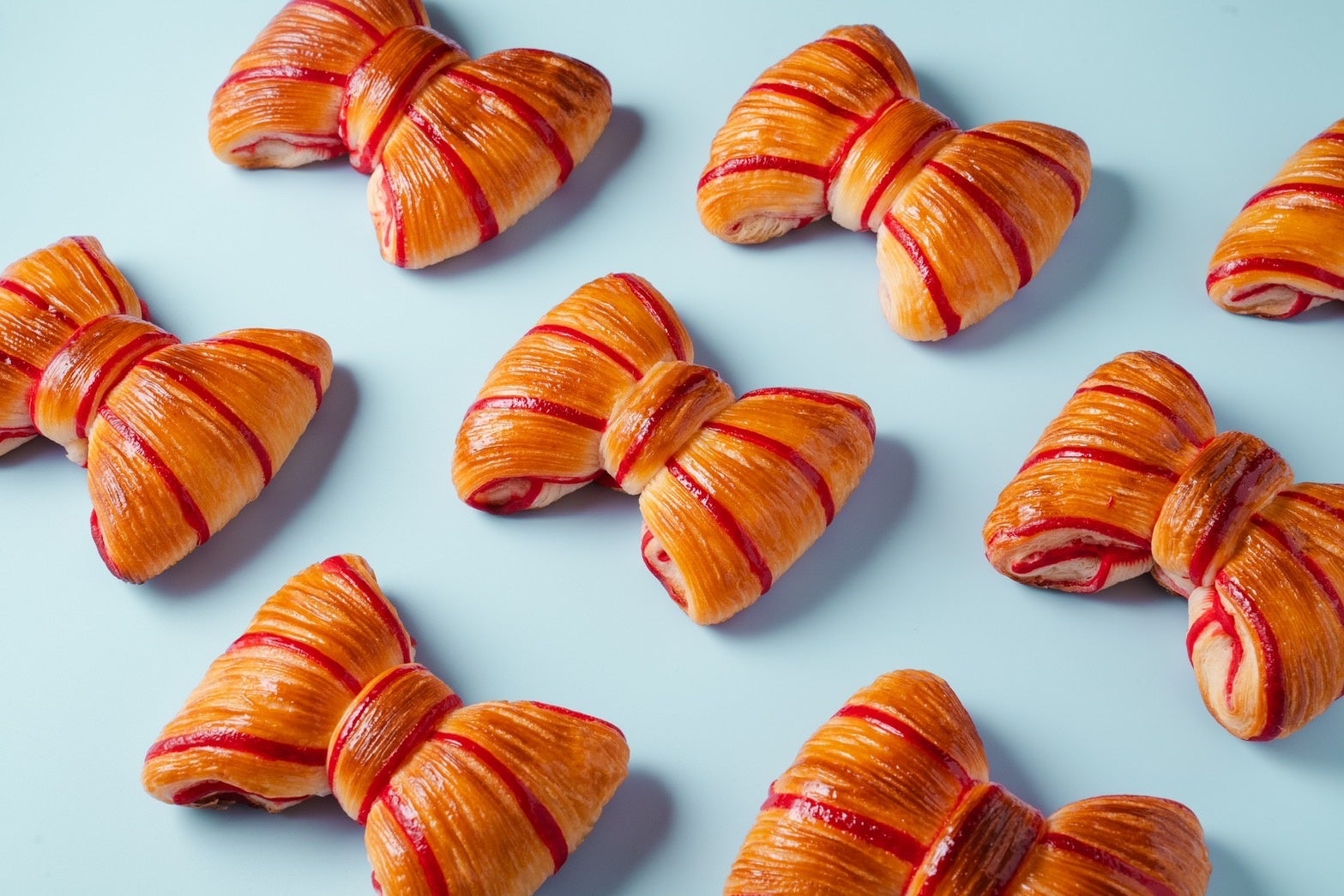 「リボンパン」は、イスズベーカリーと山本宝のコラボ企画によるオリジナル商品。イスズベーカリー(https://isuzu-bakery.jp/ )が販売しているサクサクのクロワッサンに、北野異人館で可愛く楽しめる赤いリボン型を採用しました。