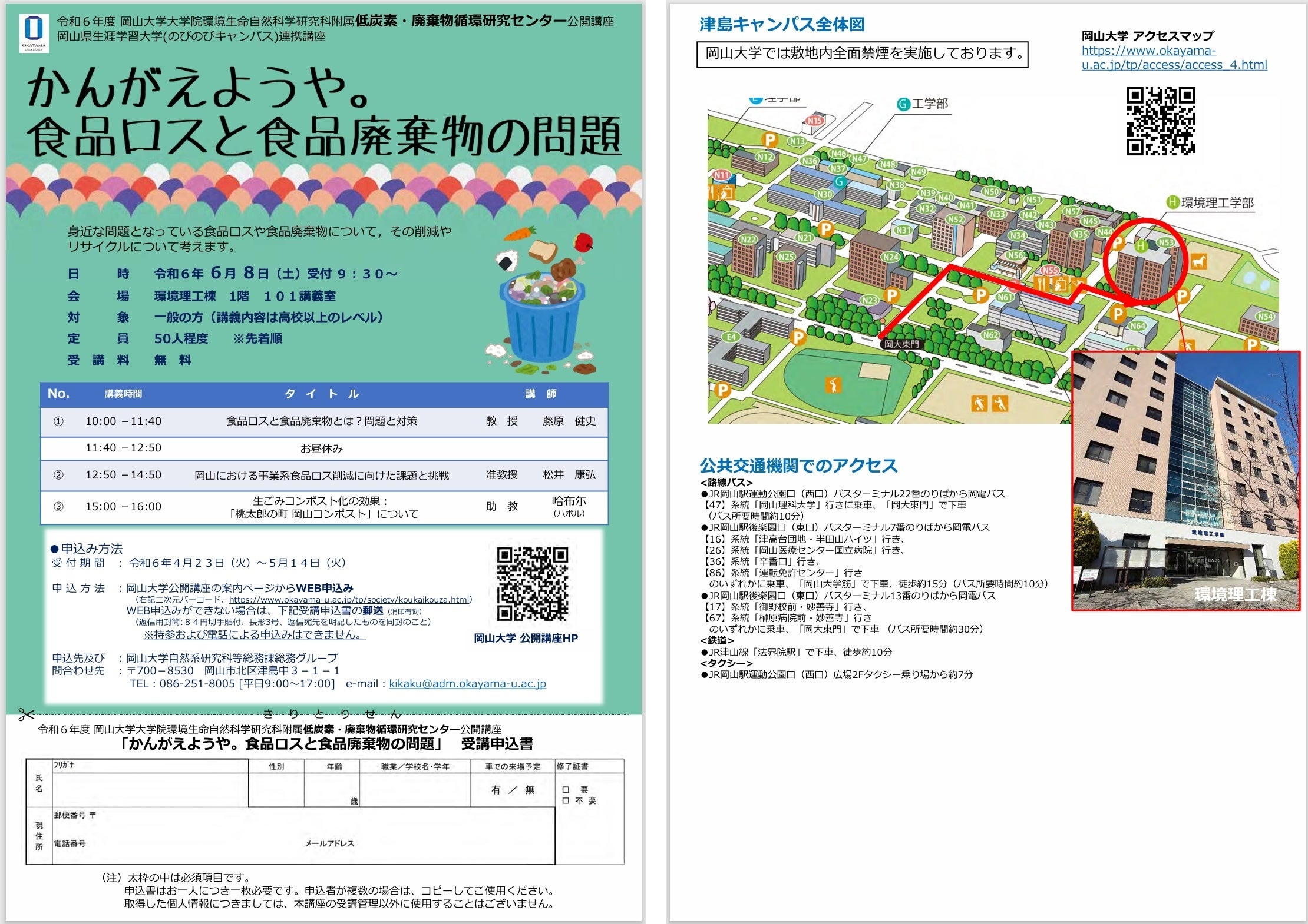 国立大学法人岡山大学(本部:岡山市北区、学長:那須保友)は公開講座「かんがえようや。食品ロスと食品廃棄物の問題」を、2024年6月8日(土)に本学津島キャンパスの環境理工棟1階101講義室で開催します。
