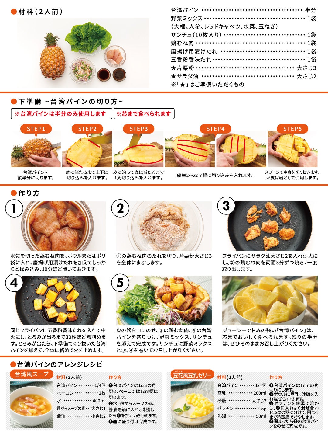 芯まで柔らかく、ジューシーで甘みが強い台湾パインを、まるごと贅沢に使用しました。鶏肉は、中国や台湾などで有名な5種以上の香辛料をブレンドした「五香粉」入りのたれで仕上げます。甘く香り豊かな台湾パインを、スパイシーで刺激的な唐揚げとともにお楽しみください。*台湾パインを使用したアレンジレシピ付き