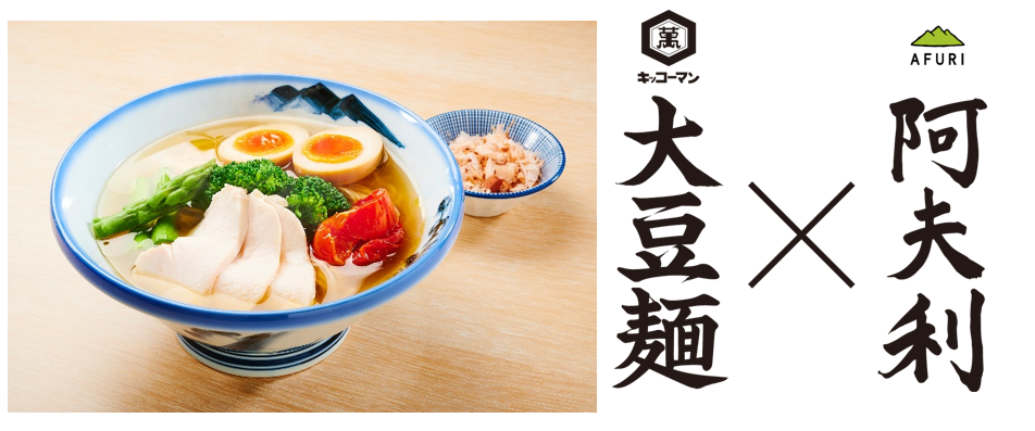 このたび、糖質やたんぱく質を意識した“筋活”の方にもおいしいラーメンを届けたいAFURIの想いと、キッコーマンの低糖質・高たんぱく麺「大豆麺」のコンセプトが合致し、期間限定のコラボレーションメニューを開発し、提供に至りました。両社の開発力を合わせ、新たな食のよろこびをお届けしてまいります。