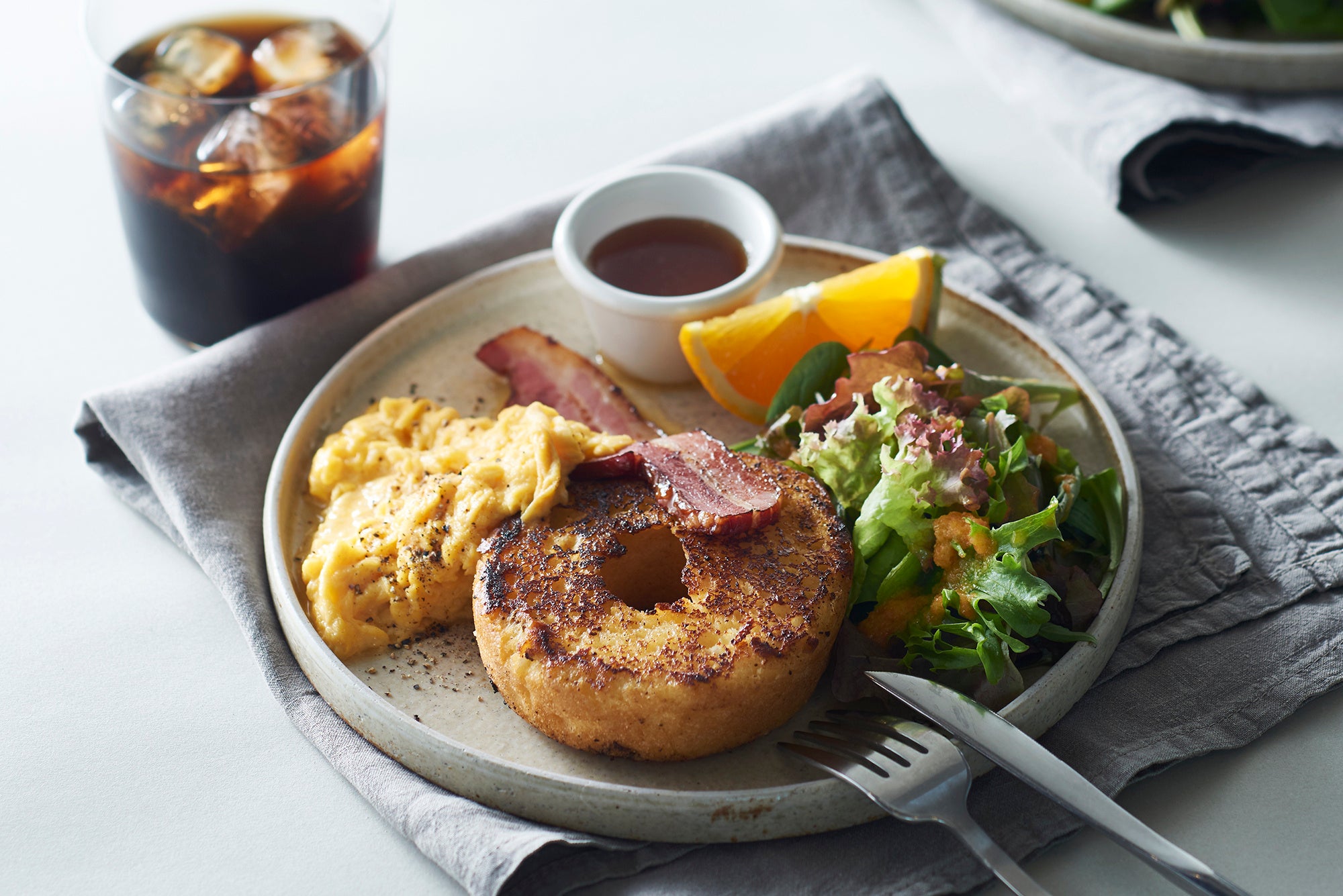 柔らかで風味豊かな“京都ぽーく”のベーコン、京都美山の豊かな自然で育った平飼い卵を使用したスクランブルエッグに、ドーナツメルト生地の自家製フレンチトーストを合わせた贅沢なモーニング限定プレート。