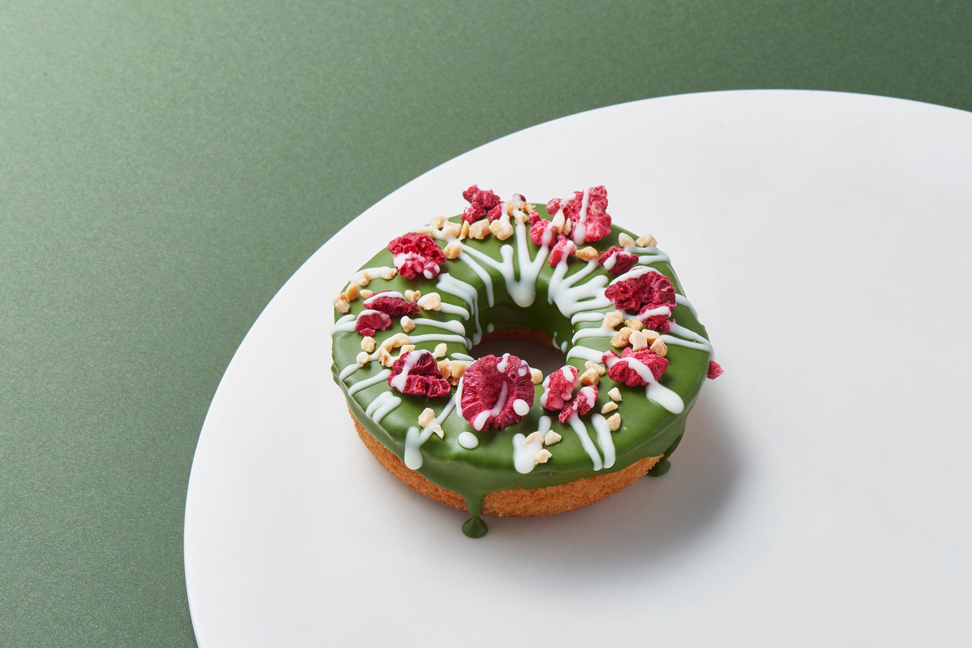 しっとりとしたベイクドーナツの美味しさを引き立てる京都産宇治抹茶“おくみどり”チョコのグレーズに、色鮮やかなドライラズベリーとアーモンドをトッピング。濃厚で華やかな抹茶チョコのドーナツです。