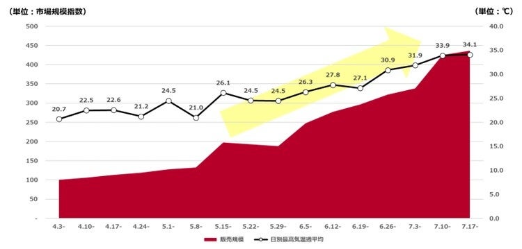 昨年は5月から最高気温が30度以上を超える真夏日も観測され、気温上昇の傾向が見られました。またこのような気温の変化に伴い、塩フレーバー商品の販売規模は5月中旬から気温の上昇と共に拡大しています。※