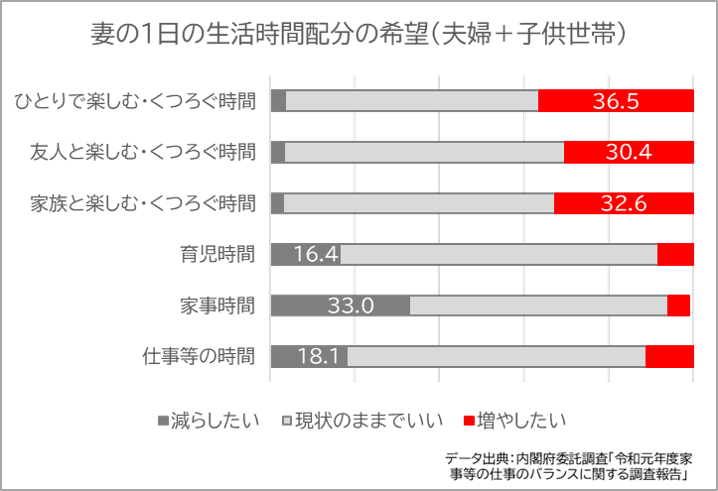 このような状況から、既婚女性は「くつろぐ時間」をもっと増やしたいと考えています。特に「ひとりで楽しむ」の意向が高いことから、「忙しいからこそ、少しの時間でもいいので自分リセットしたい」気持ちが強いことが推測できます。