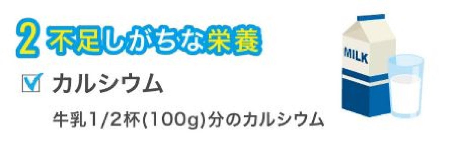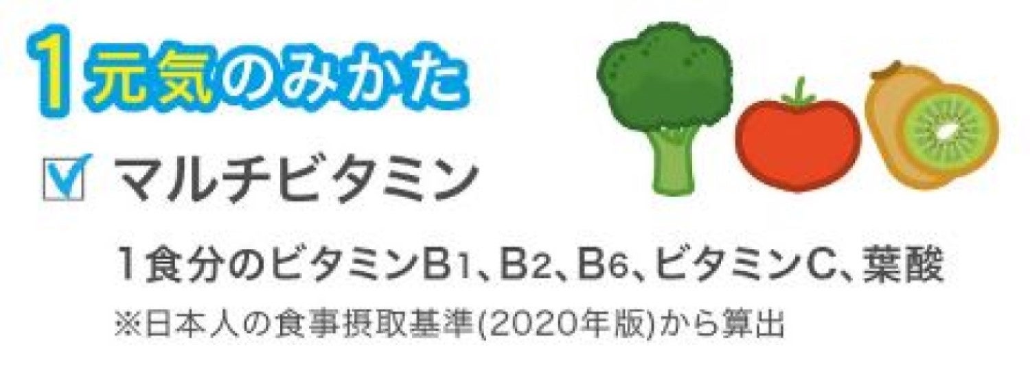 また、元気のみかたになる5種類のビタミン(ビタミンB1・B2・B6、ビタミンC、葉酸)を1食分(※2)、不足しがちなカルシウムを牛乳1/2杯(100g)分配合しています。