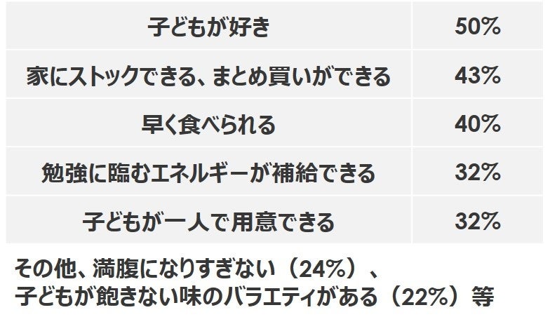 一方、塾に通う中学生の親は、勉強を頑張る子どもを応援したいからこそ、「子どもが好きな味」「早く食べられる」「勉強に臨むエネルギーが補給できる」「でも満腹になりすぎない」など、「塾前食」を選ぶにあたり気にかけたいことがたくさんあることも分かりました。【図2】