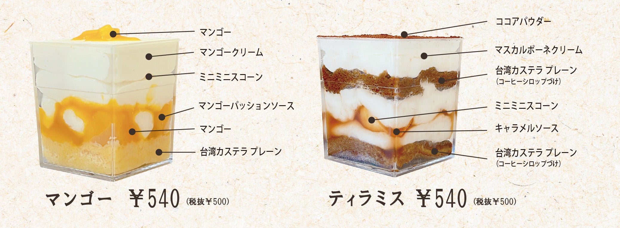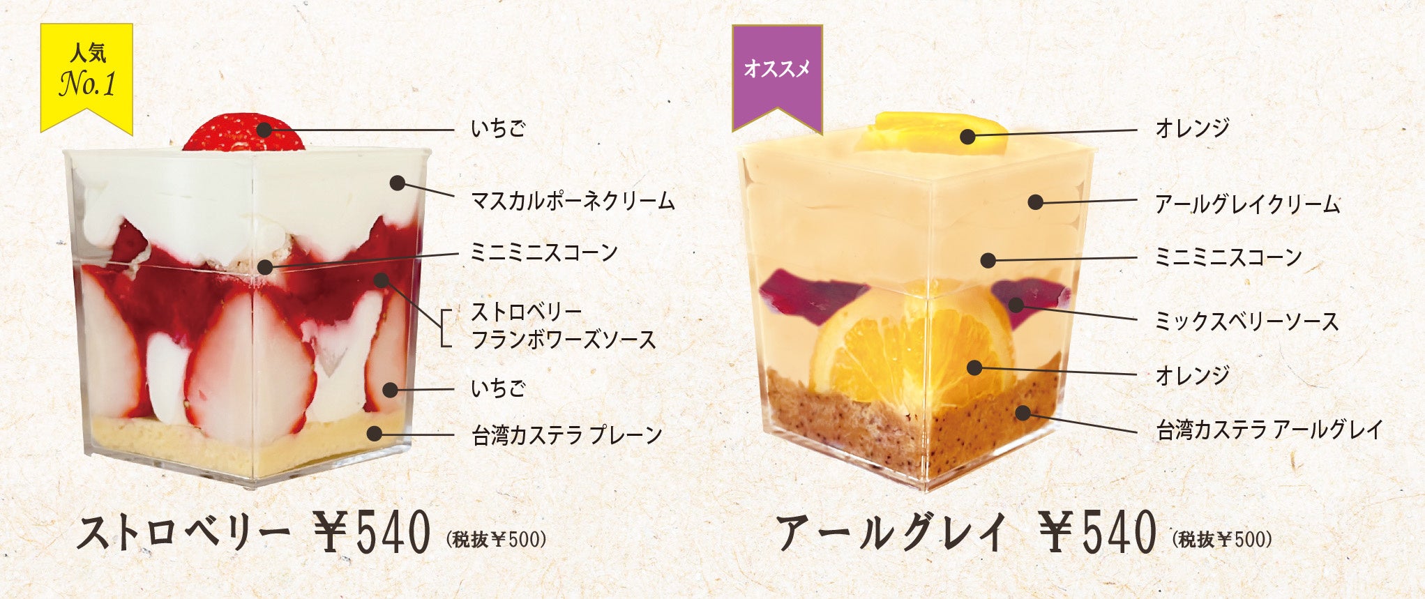 ふわふわの自家製台湾カステラの上に、それぞれ味が違う生クリーム&ソースとフルーツなどを詰めこみ、まるでショートケーキのように仕上げました。