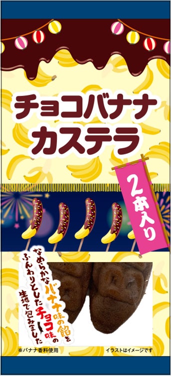商品特徴:夏祭りの屋台をイメージしたバナナカステラです。なめらかなバナナ味の餡をふんわりとしたチョコ味の生地で包みました。