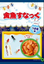 商品特徴:縁日の金魚すくいをイメージした金魚型のスナックです。出汁のきいた味付けで、食べる手がとまらない美味しさです。